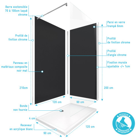 Pack 2 panneaux muraux wall'it noir + receveur whiteness ii 120 + paroi de douche freedom 2 thin transparent 120 + barre de fixation chrome Aurlane - PACP042