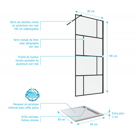 Pack paroi de douche 90x195 cm + receveur en acrylique blanc effet pierre 90x90 Aurlane - PACF093