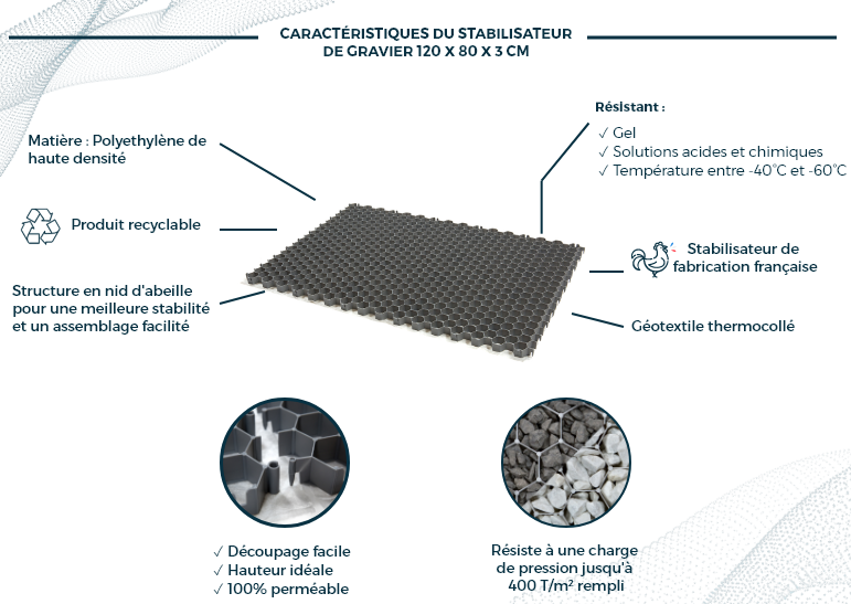 Cette solution vous permet de maintenir en place votre gravier, évite la formation de flaques d’eau et la pousse de mauvaise herbes grâce au géotextile ultra résistant, perméable et thermocolé.