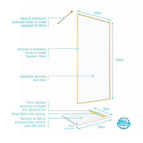 Paroi de douche 100x200cm + grille finition or doré brossé + receveur blanc effet pierre 100x80x4cm Aurlane - PACF413