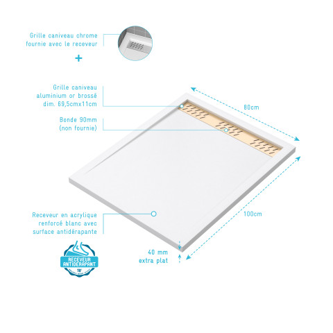 Receveur en acrylique blanc 80x100x4 cm + grilles linéaires chrome et or brossé - whiteness ii Aurlane - PACR153